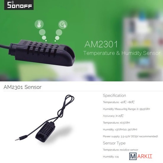 Цифровой датчик температуры и влажности Sonoff AM2301 для устройств удаленного управления и мониторинга.Данный датчик является дополнением (опцией), для использования с устройствами Sonoff TH10/TH16 и снабжен специальным разъемом для подключения к этим устройствам.При управлении выключателем Sonoff TH10/TH16 датчик Sonoff AM2301 позволяет использовать функции, зависящие от температуры и влажности, измеряемые датчиком.Датчик должен быть подключен к Sonoff TH10/TH16, до включения питания модуля. Не рекомендуется подключать или отключать датчик после включения питания.Датчик оснащен кабелем и 2,5 мм. штекером.- Датчик не является водонепроницаемым датчиком.- Для корректной работы датчика температуры AM2301 допускается длина до 60 метров.- Диапазон рабочей температуры: от -40 до +80;- Диапазон рабочей влажности: от 0 до 99.9%RH;- Точность измерения при температуре 25°С (температура): ±0.5%RH;- Точность измерения при температуре 25°С (влажность): ±3%RH(10...90%RH);- Тип сенсора (температура): резистивный датчик;- Тип сенсора (влажность): емкостный датчик;- Напряжение питания: 3.0-5.2V (рекомендуется 5V);- Длина (кабель с датчиком): 0.5 метра;- Максимально расширяемая длина: до 60 метров;- Разъем: jack 2,5мм.;- Размер датчика: 60x30x19 мм;