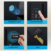 Электронный, биометрический замок. Открытие замка - отпечатком пальца, паролем, ключом, картой. Программируется на 100 отпечатков пальцев и паролей. Сохраняет работоспособность при температуре от -25С до +50С. Заряда батареек хватает более чем на год. Есть функция уведомления при разряде. Замок работает от 4 батареек типа АА.Реверсная дверная ручка для установки с правой/левой стороны. TUYA приложение на русском языке. Удаленная разблокировка. Дистанционный мониторинг-просматривайте журнал активности посетителей, которые входили/выходили в ваш дом. Встроенная защитная сигнализация от демонтажа.