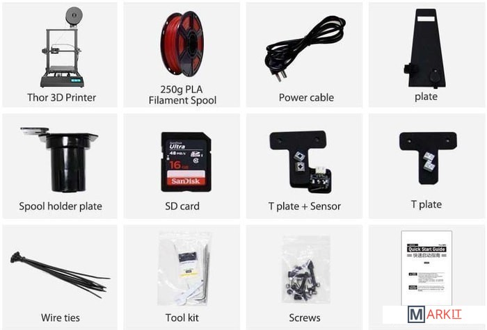 Комплектация 250 г PLA пластика;кабель питания; держатель катушки;SD карта памяти;T-пластина + сенсор;T пластина;стяжки;набор инструментов;крепеж;документация.