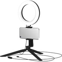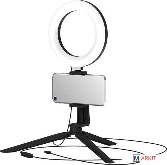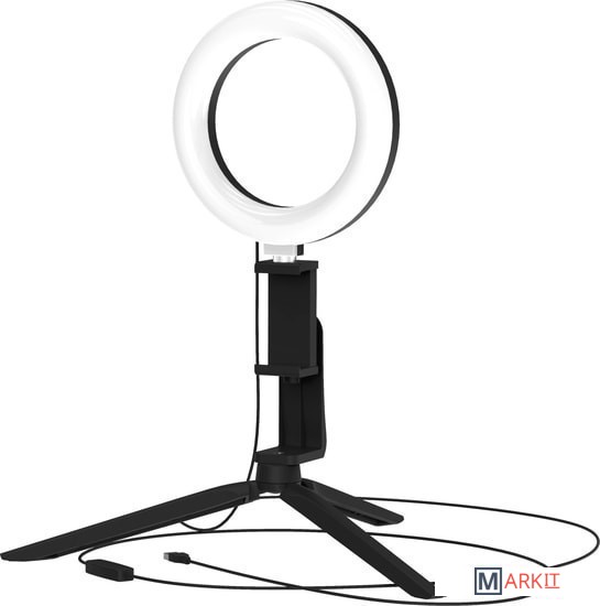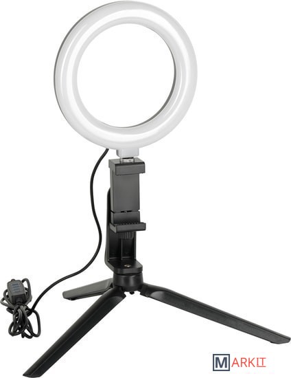 Основные особенности:- диаметр внешнего кольца - 160 мм- диаметр внутреннего кольца - 110 мм- три режима подсветки (теплый свет, холодный свет, нейтральный свет)- регулировка яркости (9 уровней)- индекс цветопередачи 60 CRI- угол рассеивания света130 °- встроенный настольный штатив (трипод)- встроенный держатель для смартфона- пульт управления на кабеле- длина кабеля питания 2 м