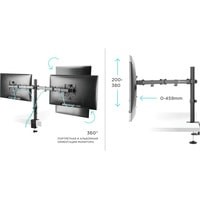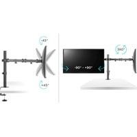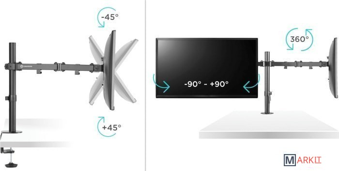 Функциональные особенности поворотный, кабель-канал, струбцинное крепление / поворотный, кабель-канал, струбцинное крепление, для 2 мониторов