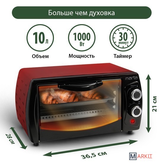 Данная модель оснащена:• Двумя кварцевыми нагревательными элементами суммарной мощностью 1000 Вт;• Камерой объемом 10 литров;• Возможностью настройки температуры от 70 до 230°С;• Таймером со звуковым сигналом и автоматическим выключением прибора;• Аксессуарами: противень, решетка.Всё это сделает процесс приготовления горячей пищи удобным и быстрым!• Механическое управление делает простым и понятным выбор настроек.• Два мощных нагревательные элемента быстро прогревают камеру, поэтому электрический духовой шкаф Marta поможет Вам приготовить самые вкусные горячие блюда и чудесную домашнюю выпечку с румяной корочкой без потери времени.• Компактная камера объемом 10 литров позволит готовить блюда за считанные минуты.• Встроенный таймер позволит с легкостью отслеживать время приготовления блюд. По истечении установленного времени, духовой шкаф выключится автоматически, а звуковой сигнал об окончании приготовления напомнит о готовности блюда.• Надёжные компоненты прибора обеспечат длительный срок службы и бесперебойную работу.• Электрический духовой шкаф Marta – Ваш отличный помощник на кухне, используя который станет просто и приятно радовать себя и своих близких вкусными горячими блюдами!