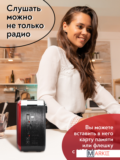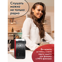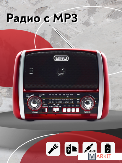 Портативный радиоприёмник с фонариком - радио колонка MP3 c работой от сети аккумулятора и батареек. Радиоприемник MIRU SR-1025 выполнен в красно-чёрном корпусе с ретро дизайном и представляет собой простое устройство для воспроизведения потокового радио вещания. Модель предусматривает всего один динамик, но этого вполне достаточно, чтобы вы получили насыщенный звук. Радиоприемник улавливает радио каналы в диапазоне FM, АМ и SW, гарантируя отличную связь благодаря встроенной телескопической антенне, которая способствует улучшению сигнала. MIRU SR-1025 имеет линейный аудио вход и поддержку чтения microSD карт. Благодаря тому что, радиоприёмник работает не только от сети 220 В, но и от аккумулятора или батареек, он является мобильным устройством. Вы сможете взять его на пикник и наслаждаться трансляцией любимой радио передачи в компании с веселыми ведущими. Для управления устройства предусмотрены механические переключатели.