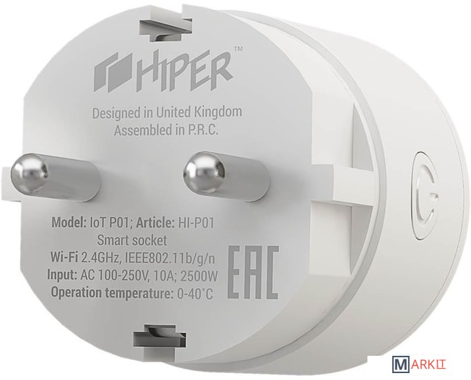 Предназначена для удаленного включения/выключения электроприборов, а также для поддержки исполняемых сценариев.Поддержка голосовых помощников Яндекс Алиса и Google Home. Управлять включением/выключением данной розетки возможно, как при помощи "умных колонок", так и через голосовые помощники на телефоне или планшете.Простота установки и настройки. Чтобы установить эту розетку, не нужно быть электриком, достаточно ее воткнуть в действующую розетку и настроить в соответствии с инструкцией.Удобство настройки сценариев HIPER IoT. Простая и интуитивно понятная настройка сценариев.Поддержка облачных технологий. Благодаря облачным технологиям устройства умного дома от HIPER, могут работать полностью автономно (без управляющих модулей), достаточно лишь подключить устройство к приложению и обеспечить доступ к Wi-Fi и Internet.Безопасность и дистанционное включение/отключение. Для удаленного выключения/включения необходимо обеспечить подключение розетки к WiFi и смартфона/планшета к интернету, теперь по дороге на работу, не нужно переживать отключили ли вы утюг, достаточно зайти в приложение, проверить, и при необходимости выключить.Управление по расписанию. В соответствующем разделе приложения розетку можно включать и выключать, в том числе по таймеру обратного отсчета и по расписанию.Сохранение настроек при выключении электроэнергии. При включении-отключении от сети розетка восстанавливает последнее состояние — если они были выключены, то выключенными и останутся.Максимальная сила тока: 10АМощность нагрузки: до 2500ВтВход: AC 100-250В, 50/60 Гц