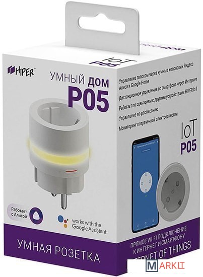 Умная розетка с мониторингом энергии и LED светильником Wi-Fi HIPER IoT P05Розетка рассчитана на работу с мощными электроприборами (до 3,6 кВт). Предназначена для удаленного включения/выключения электроприборов, а также для поддержки исполняемых сценариев.Возможность работы с мощными электроприборами. Максимальная сила тока: 16 А, а мощность: до 3680 Вт.Поддержка голосовых помощников Яндекс Алиса и Google Home. Управлять включением/выключением данной розетки возможно, как при помощи «умных колонок», так и через голосовые помощники на телефоне или планшете.LED - подсветка корпуса розетки. Подсветка помогает легко обнаруживать розетку в темноте.Простота установки и настройки. Чтобы установить эту розетку, не нужно быть электриком, достаточно ее воткнуть в действующую розетку и настроить в соответствии с инструкцией.Удобство настройки сценариев HIPER IoT. Простая и интуитивно понятная настройка сценариев.Поддержка облачных технологий. Благодаря облачным технологиям устройства умного дома от HIPER, могут работать полностью автономно (без управляющих модулей), достаточно лишь подключить устройство к приложению и обеспечить доступ к Wi-Fi и Internet.Безопасность и дистанционное включение/отключение. Для удаленного выключения/включения необходимо обеспечить подключение розетки к WiFi и смартфона/планшета к интернету, теперь по дороге на работу, не нужно переживать отключили ли вы утюг, достаточно зайти в приложение, проверить, и при необходимости выключить.Мониторинг потребляемой энергии. В приложении есть возможность отслеживать статистику потребления электроэнергии приборами, подключенными к данной розетке.Управление по расписанию. В соответствующем разделе приложения розетку можно включать и выключать, в том числе по таймеру обратного отсчета и по расписанию.Сохранение настроек при выключении электроэнергии. При включении-отключении от сети розетка восстанавливает последнее состояние — если они были выключены, то выключенными и останутся.