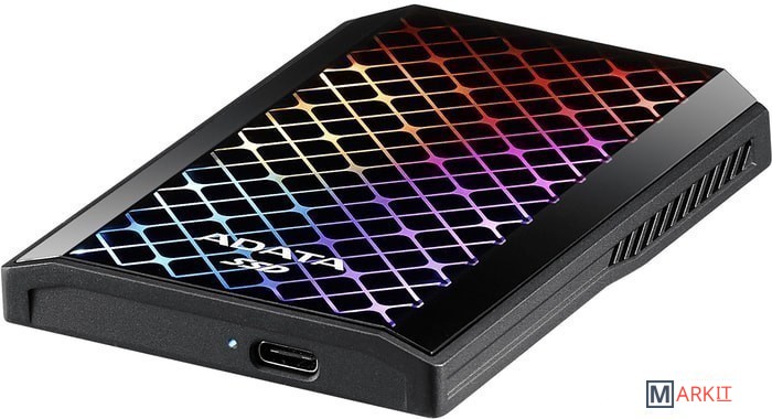 Накопитель оснащен RGB панелью, которая занимает 74% передней крышки устройства.